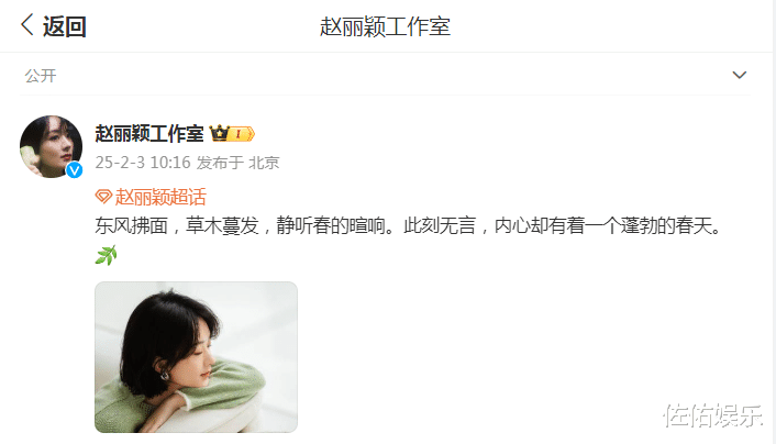 2月3日是大年初六,也刚好是星期一,同时也是立春,当天早上10:16分,赵丽颖工作室也一如既往的在社交平台上分享了一张美照,并为此配文:“东风拂面,草木蔓发,静听春的暄响。此刻无言,内心却有着一个蓬勃的春天。”这也受到了网友们的广泛关注。